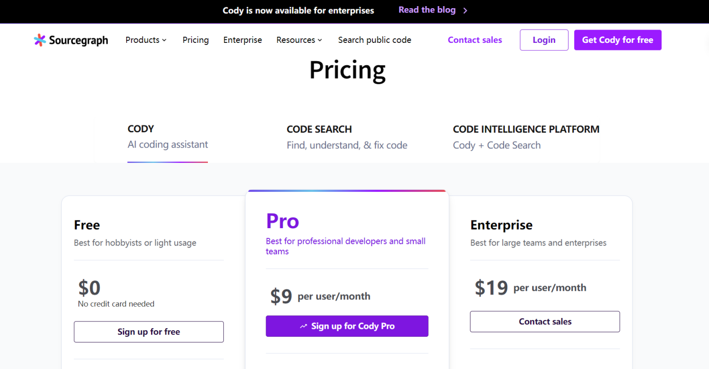 Cody产品分3个平行版本:免费版、专业版、企业版。