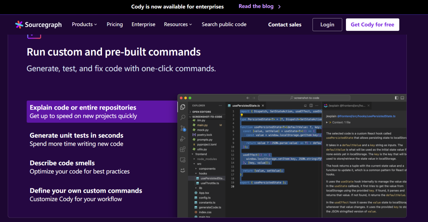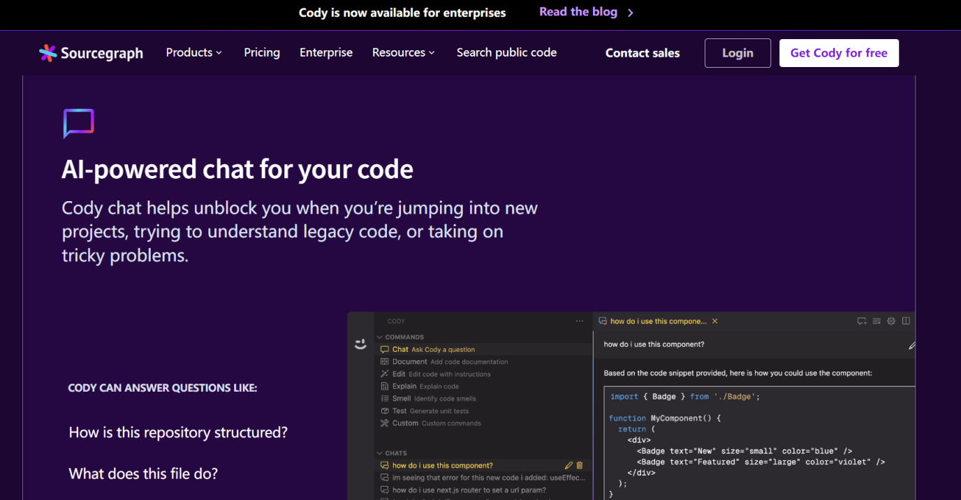 Cody可以根据代码库的上下文和样式生成从样板代码到AP!解析器的所有内容,还可以修复代码块的错误、可读性或未处理的边缘情况。