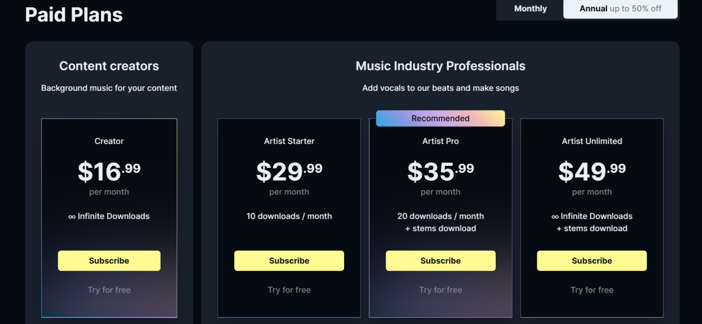 收费版:每月价格为16.99美元(按年计费)。这个版本除了包含免费版的所有功能外,还允许用户将生成的音乐用于个人和商业用途。对于需要频繁下载音乐的用户,收费版提供了每天最多下载50首歌曲的权限。