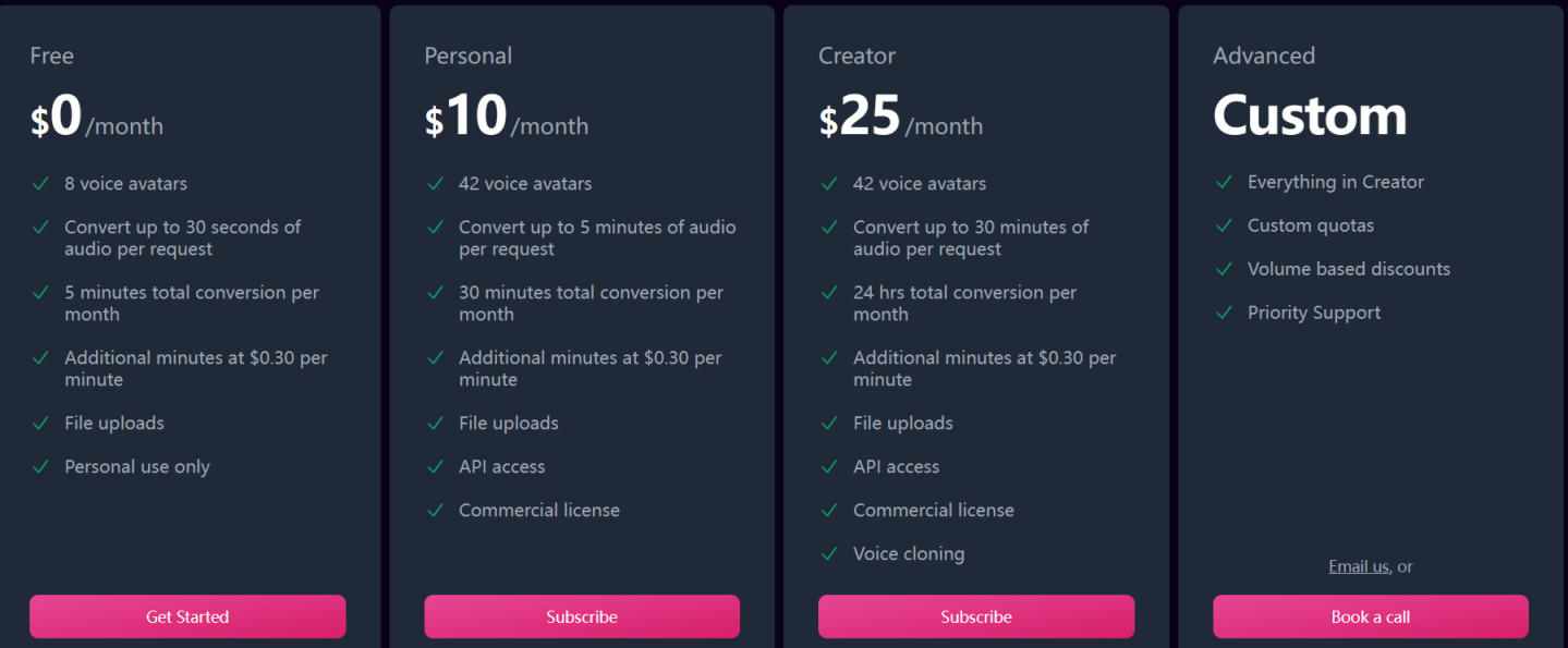 MetaVoice设置多挡定价,分为免费版、个人版、创作者版。
