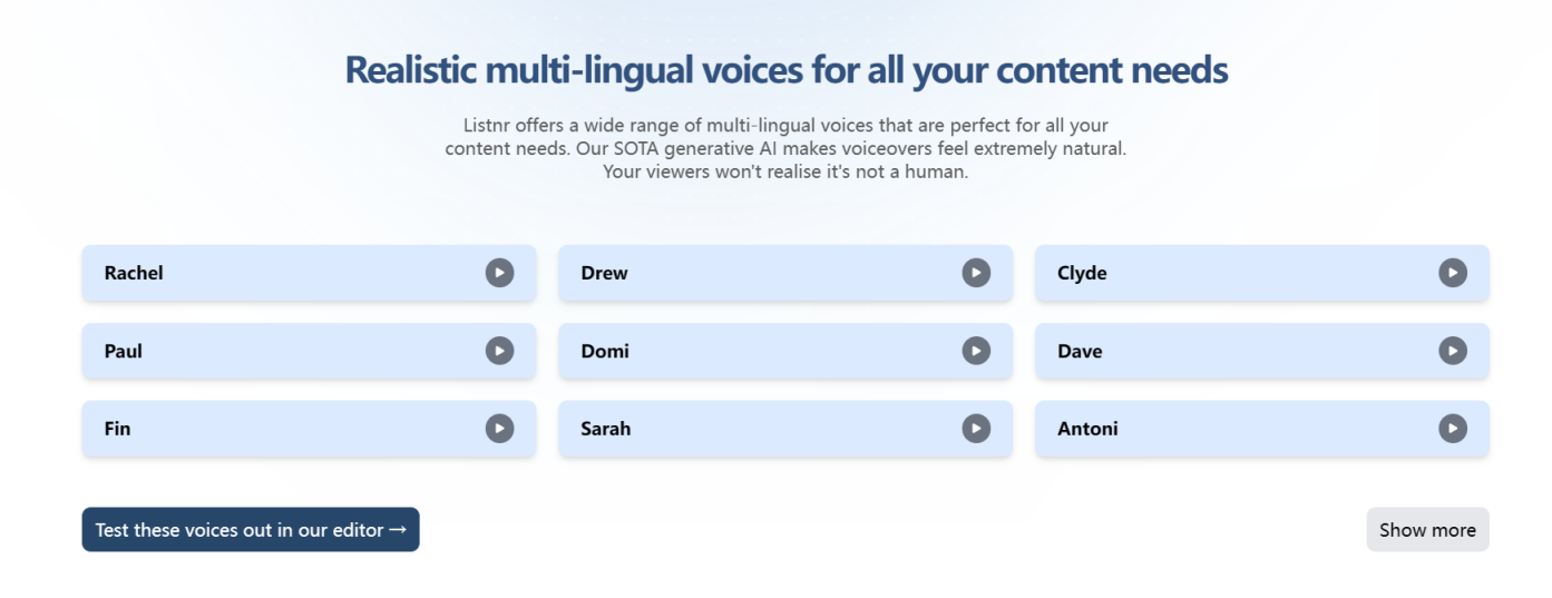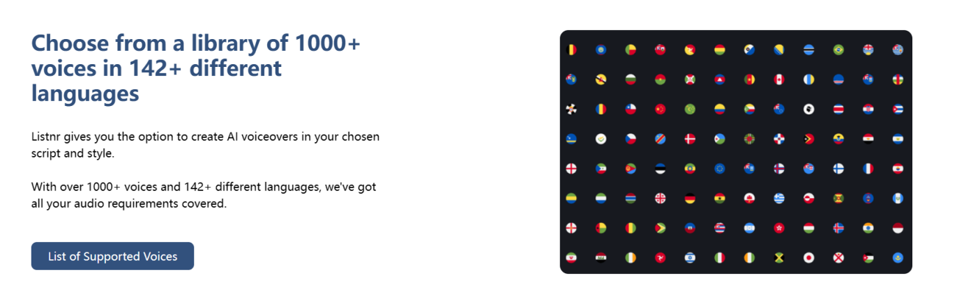 Listnr允许用户通过其文本转语音编辑器将文本内容转换为逼真的AI语音。同时,Listnr提供了一个包含1000多种声音的库,覆盖了142种不同的语音和方言,为用户提供了丰富的选择,以满足不用场景和需求的语音输出。