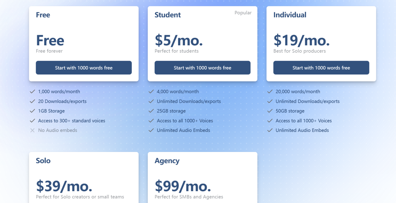 收费版又分为Student版、Individual版、Solo版和Agency版。它们都包括无限的下载/导出量、所有1000+声音的访问、以及无限音频嵌入。