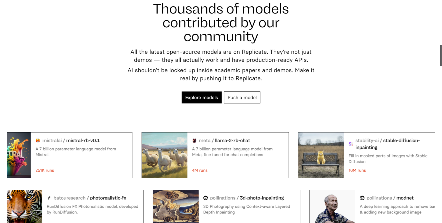 Replicate 是一个提供优秀 AI 模型和工具的平台,旨在帮助用户实现各种人工智能任务。该平台汇集了来自各个领域的顶尖模型,涵盖了文本到图像生成、语言模型、图像编辑、超分辨率等多个领域。用户可以通过 Replicate 平台来探索这些优秀的项目,并应用于自己的工作和研究中。