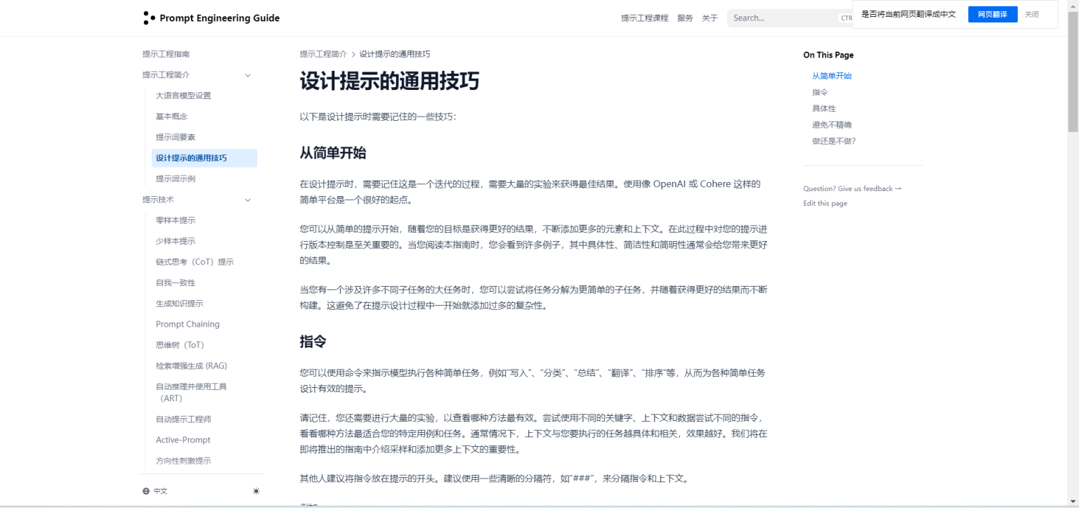 高级提示工程策略:除了基础技巧外,提示工程指南还会介绍一些高级策略,如如何使用零样本提示、少样本提示、指令微调等技术来进一步提升AI模型的性能。这些策略将帮助用户在不同场景下灵活应对各种挑战,实现更高效的AI应用。