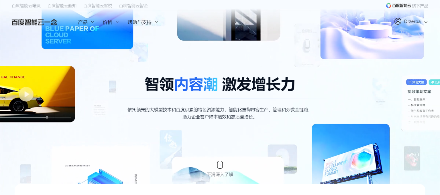 百度智能云一念是百度智能云基于其领先的大模型技术和丰富的资源能力打造的内容创作平台。借助百度文心大模型,一念平台能够智能化重构内容生产、管理和分发全链路,为企业客户提供高效、便捷的内容创作解决方案。平台集文、图、视频等多种内容模态于一体,旨在帮助企业客户更轻松地获取内容创作灵感和营销物料,从而实现降本增效和高质量增长的目标。