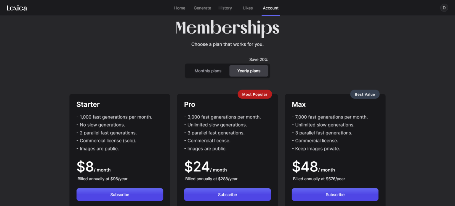 Lexica 提供免费使用,您只需注册免费帐户即可立即开始创作图像。尽管免费版本可能缺少一些高级功能,但它仍具备根据文本描述创建逼真图像和访问预制图像库的能力,是释放创意潜力的理想选择。您也可以根据自己的需求选择适合自己的套餐,并选择按月付费或者按年付费,选择年付可以享受高达20%的折扣。