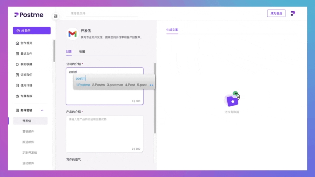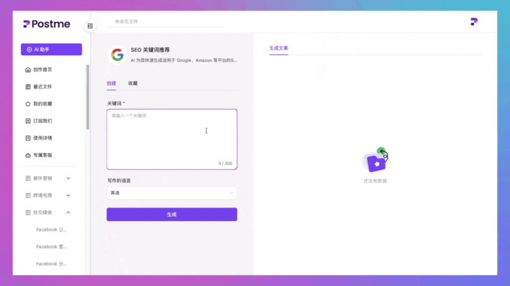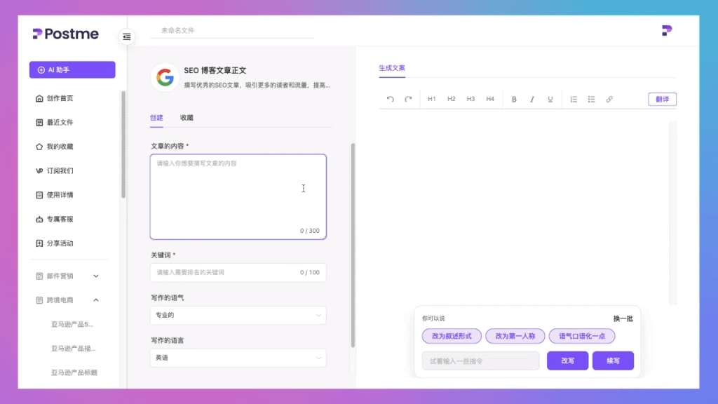Postme 是一款强大的AI写作工具,可以帮助您快速生成高质量、原创的英文营销文案,助您征服全球市场。只需简短中文描述,选择所需的语气和写作语言,即可轻松生成地道且专业的出海营销文案。