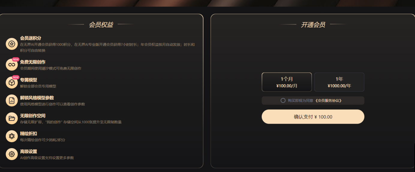 对于广大的艺术爱好者,无界AI提供了不同的付费订阅方案,用户可以根据自身需求灵活选择。