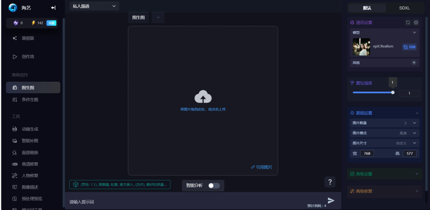 SeaArt AI的图生图功能是一项能够基于参考图像生成新图像的创作工具。用户首先准备好一张原型设计图,可以是草图、拼接图或者快速打好的草稿拍照上传,然后选择一张期望的成品效果图,进入创作过程。用户可以自定义重绘强度,范围从0到1。数值越小,生成的图片与原图越接近;数值越大,图片的变化也就越明显。