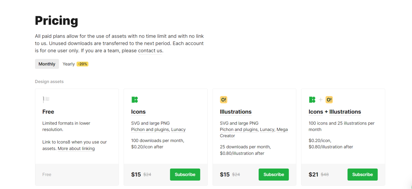 ICONS8的定价策略主要基于其提供的服务和素材类型,其中一些资源是免费的,但高级功能和下载则需付费。