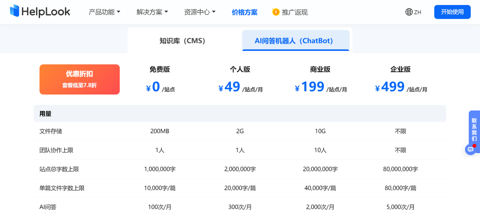 HelpLook 提供多种定价方案,满足不同企业的需求。从免费版到企业版,每个方案都包含不同的存储容量、团队协作人数、站点字数和AI问答次数,以适应从个人用户到大型企业的多种使用场景,帮助企业高效管理知识库,提升客户体验。享受优惠折扣,套餐低至7.8折,为企业提供灵活且经济的选择。