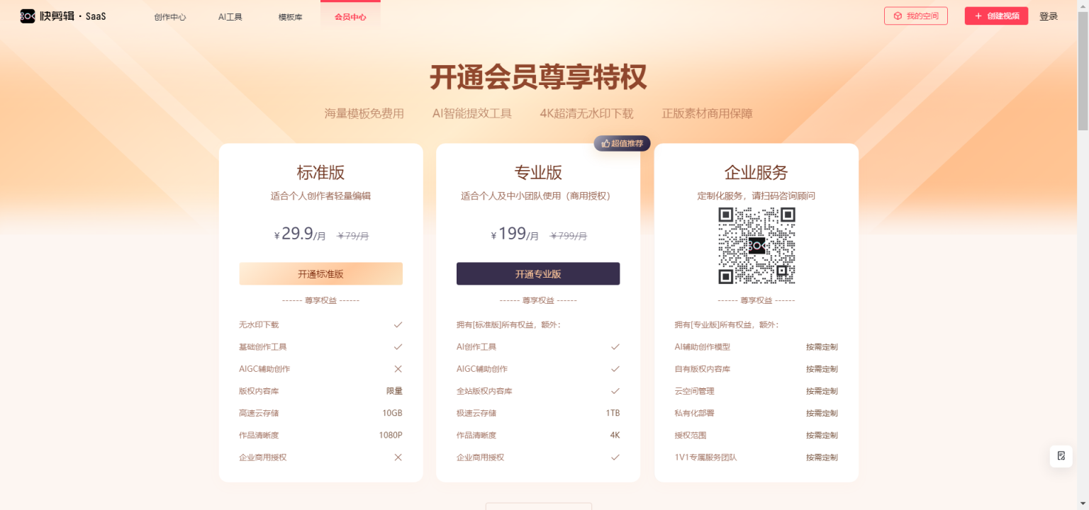360快剪辑提供了三种不同档次的定价方案,包括标准版、专业版和企业服务。