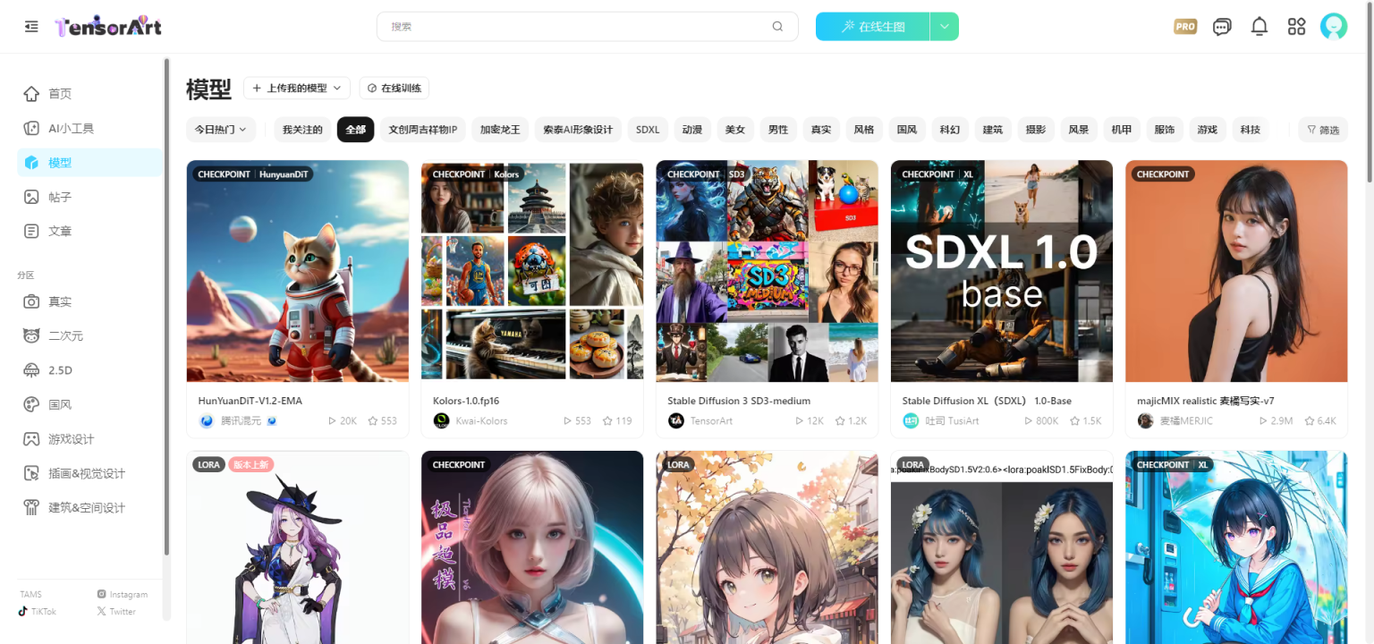 在线生成图像:用户可以通过TusiArt平台,利用预设的图像生成模型,在线生成各种风格的图片。无需下载任何专业软件,只需在网页上简单操作即可实现,大大降低了图像创作的门槛。