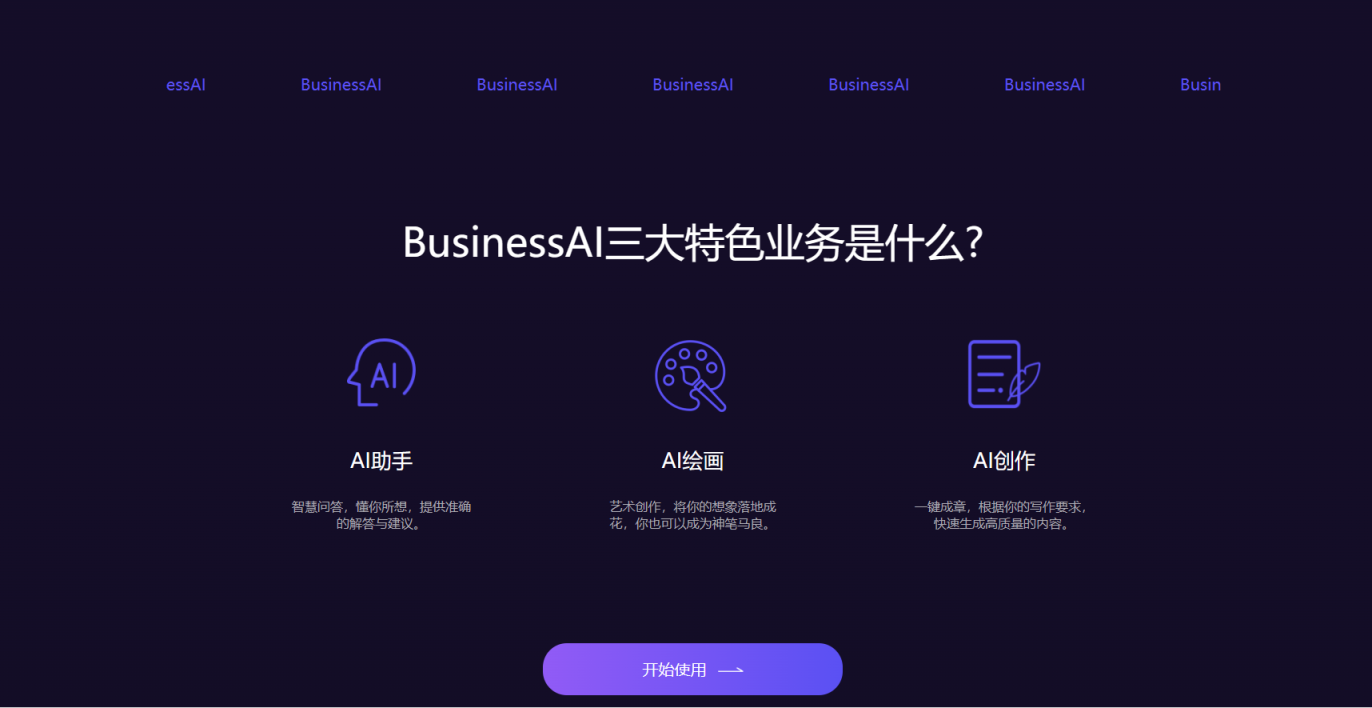 BusinessAI提供一站式AI创作工具,提高极简智能效率。它会创作、写论文、答辩、编程等,解决你头脑里的问题风暴。问你想问答你所得,与人工智能AI零距离对话。