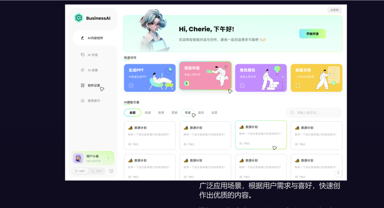 通过与BusinessAI智能助手对话,您可以获得准确的答案、创造性的写作帮助和出色的绘画作品。无论您是需要解答问题、寻找灵感还是提升创造力,BusinessAl智能助手都能满足您的需求。