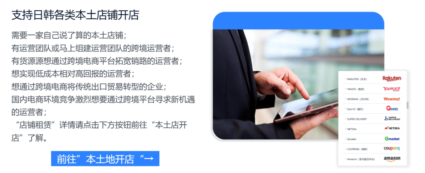 针对您的特定情况和自身需求, 提供日韩本土店开店店铺租赁、店铺托管运营、店铺合作运营、商城入住模式、店铺代理运营等多种合作运营方式,助您跳过门槛、轻松上手。