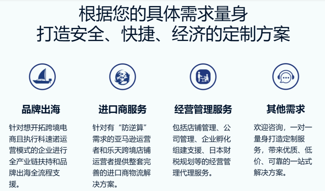 针对想开拓跨境电商且执行科速诺运营模式的企业进行全产业链扶持和品牌出海全流程支援; 针对有“防逆算”需求的亚马逊运营者和乐天跨境店铺运营者提供整套完善的进口商物流解决方案; 包括店铺管理、公司管理、企业孵化组建支援、日本财税规划等的经营管理代理服务。 及其他各类存在困难或需求的定制业务。