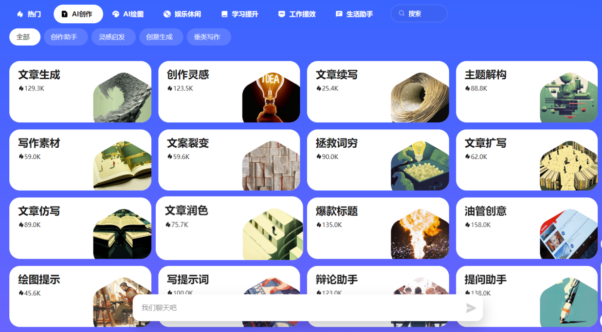 AI创作:可以实现文章生成、文章续写、创作灵感、文章润色、爆款标题、视频脚本、微型故事、写演讲稿、写公关稿等功能。