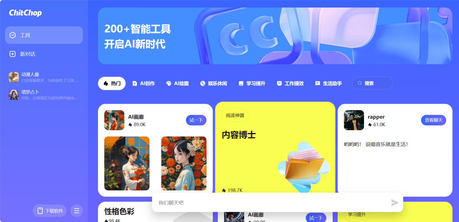 ChitChop是字节跳动在海外上线的一款免费大模型产品和人工智能助手工具箱。这款产品的目的是为用户提供丰富的智能机器人服务,从而在学习、工作和生活等多个方面为用户提供帮助。ChitChop是基于云雀大语言模型创建的AI小工具合集,其网页外观与抖音集团旗下AI产品“小悟空”有些许改动。