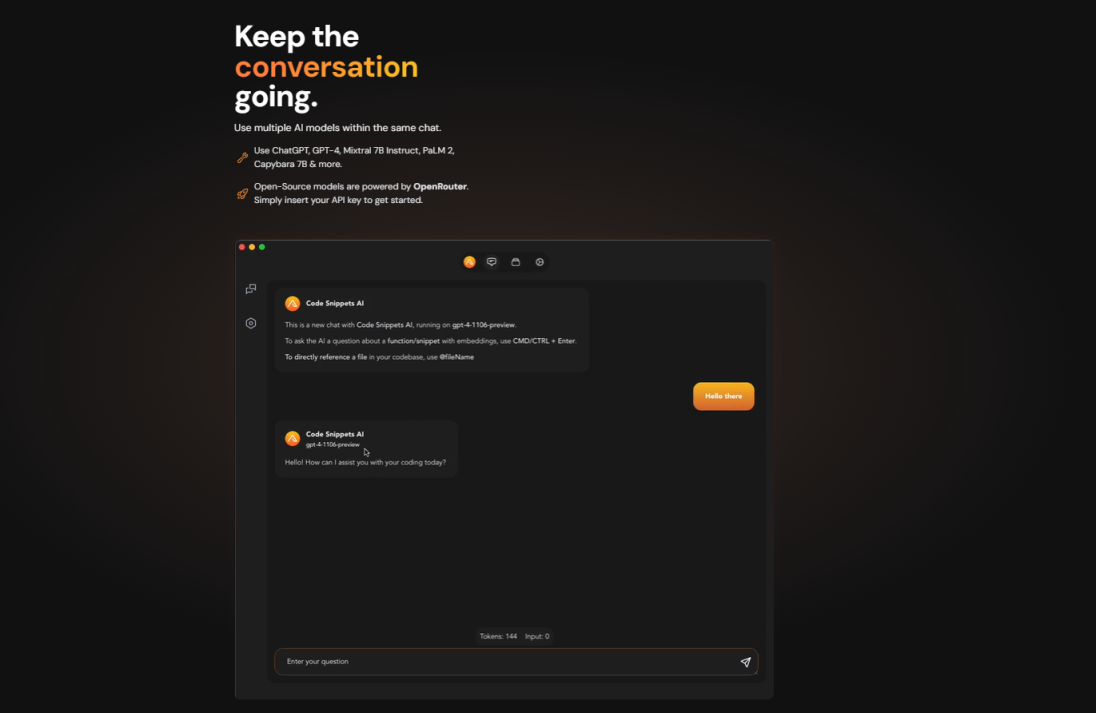 Code Snippets 是小的、可重用的代码块,可以插入到更大的程序中。它们通常用于自动化重复任务,并使开发人员更容易快速实现常用功能。代码片段可以用任何编程语言编写,范围从简单的代码行到复杂的算法。使用最新的ChatGPT模型,通过我们的自定义数据集进行微调,现在可以比标准模型更快、更准确地生成、重构、调试和创建文档。