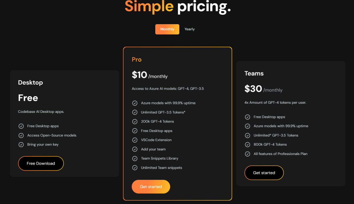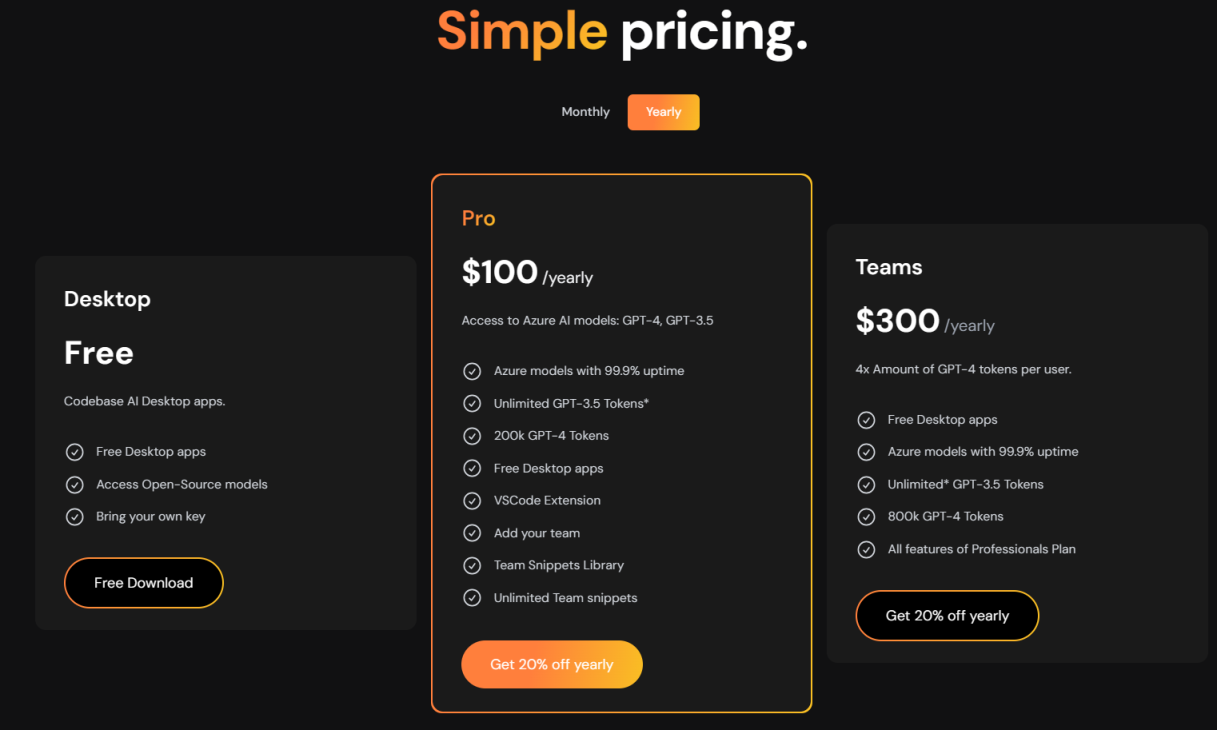 Code Snippets AI提供专业版和团队版两种会员级别的定价计划,支持月付和年付,年付享有最高 20% 的折扣。Code Snippets AI 桌面应用可以免费自由下载,但只能享受免费访问开源模型这一功能,更多功能使用需付费。
