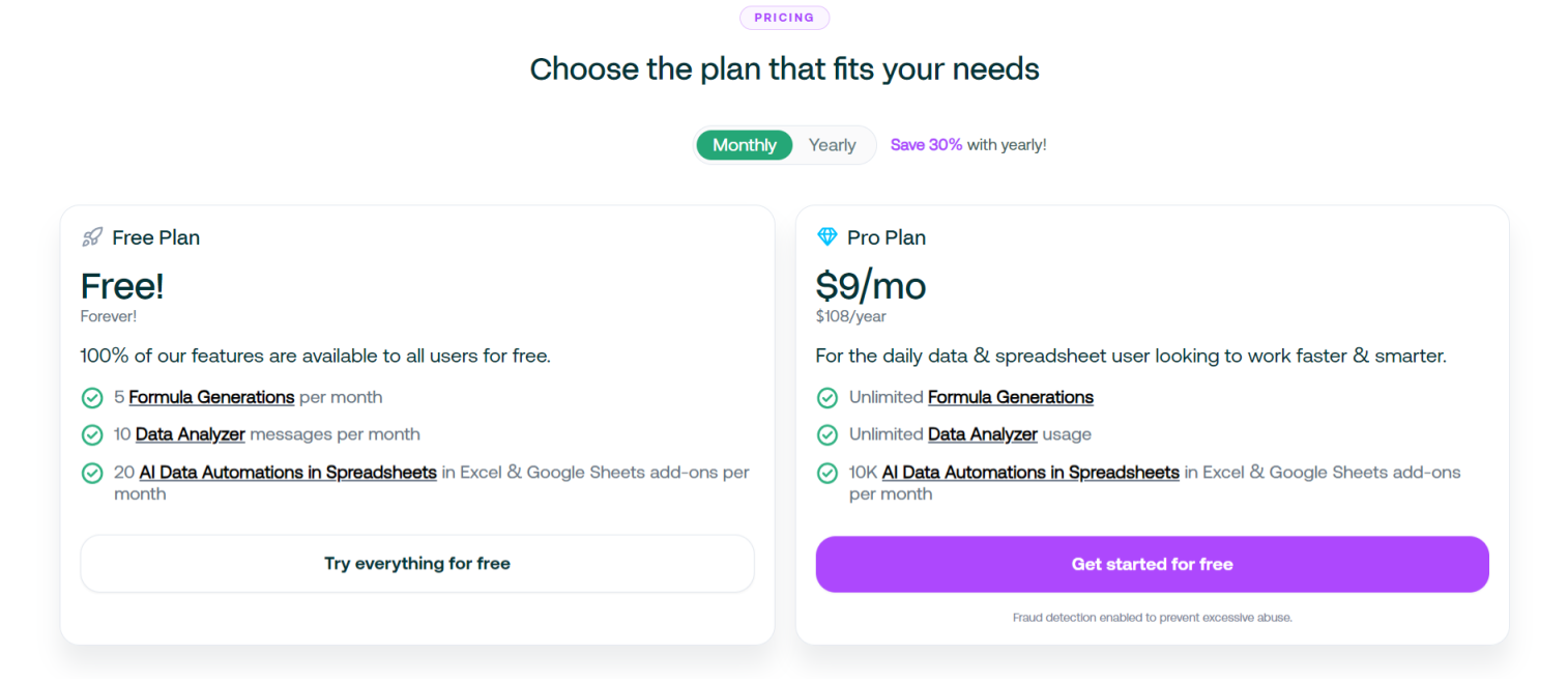 在定价方面,Excel Formula Bot 提供了适应性强的选项来满足各种用户的需求,选择年付可享受高达 30% 的折扣。