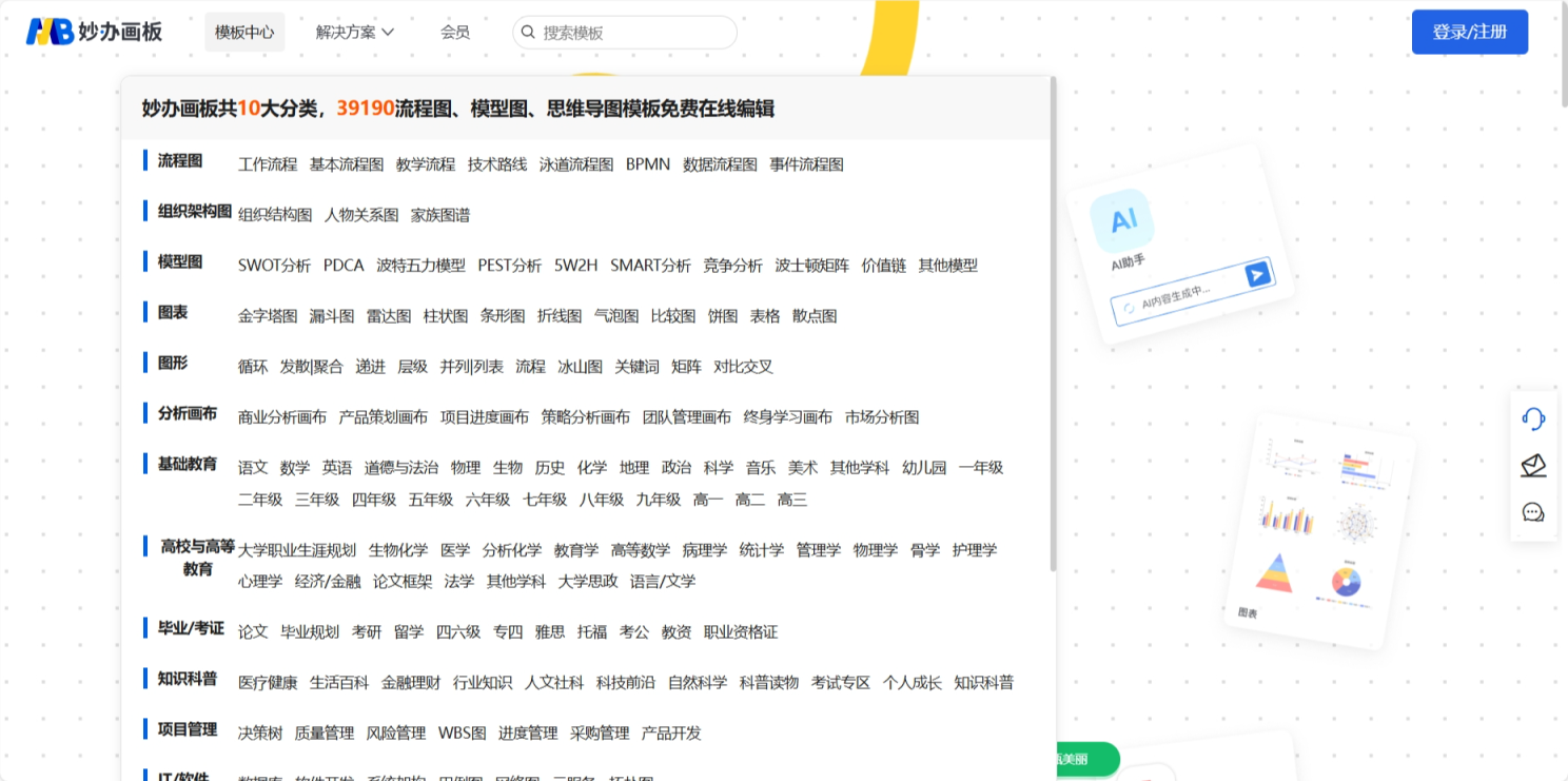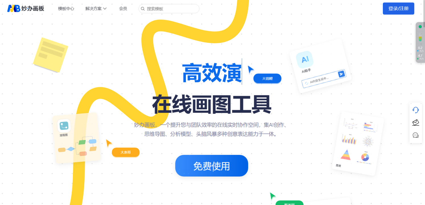 妙办画板是一款综合性的在线绘图工具,它集成了AI创作、思维导图、分析模型、头脑风暴等多种功能,旨在提升个人及团队的效率。作为一款在线实时协作的绘图工具,妙办画板不仅支持多种类型的图形绘制,还提供了丰富的模板和便捷的操作方式,使得用户能够轻松制作出高质量的流程图、思维导图等视觉资料。