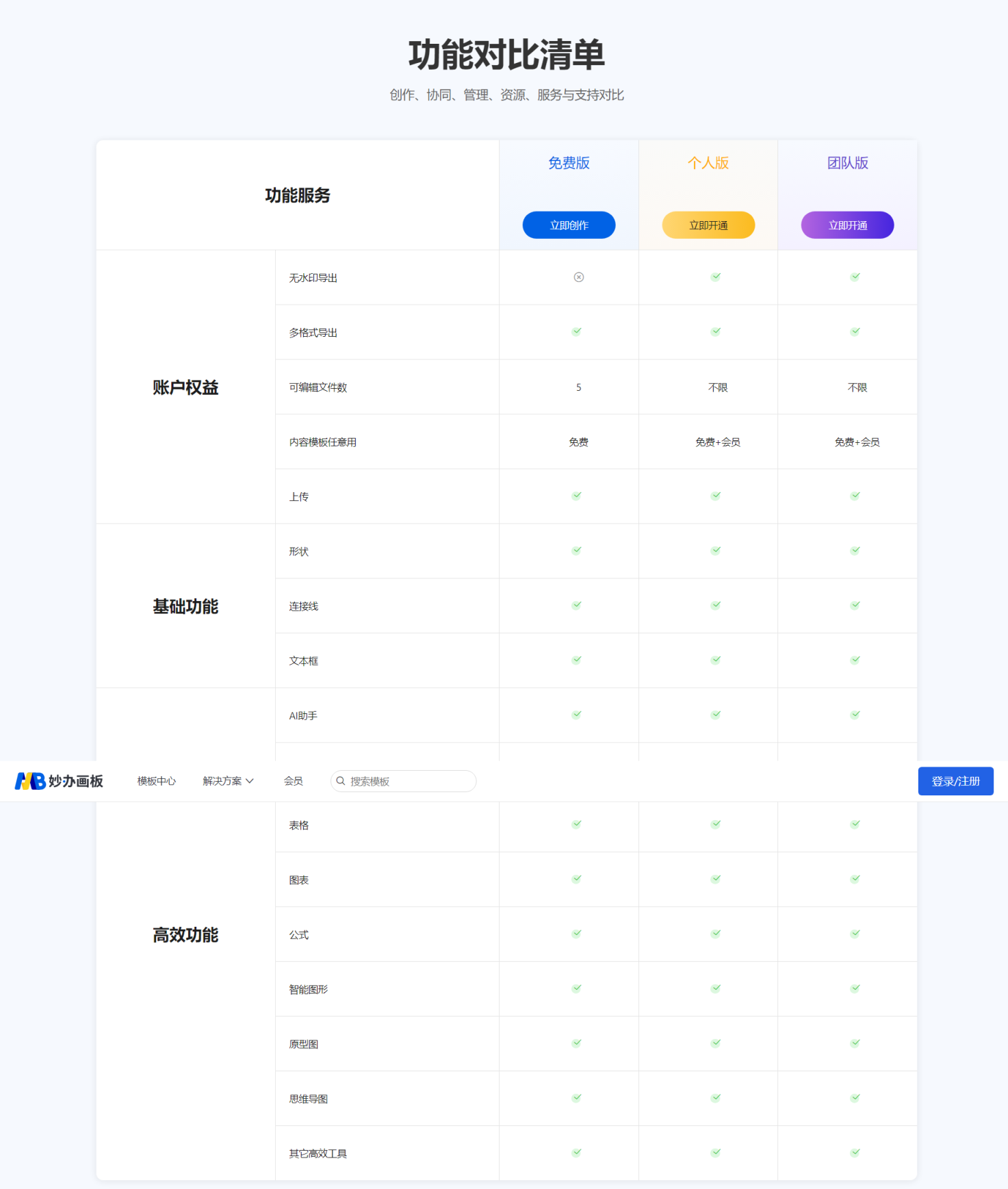 妙办画板提供了三种不同档次的定价方案,包括免费版、个人版和团队版。
