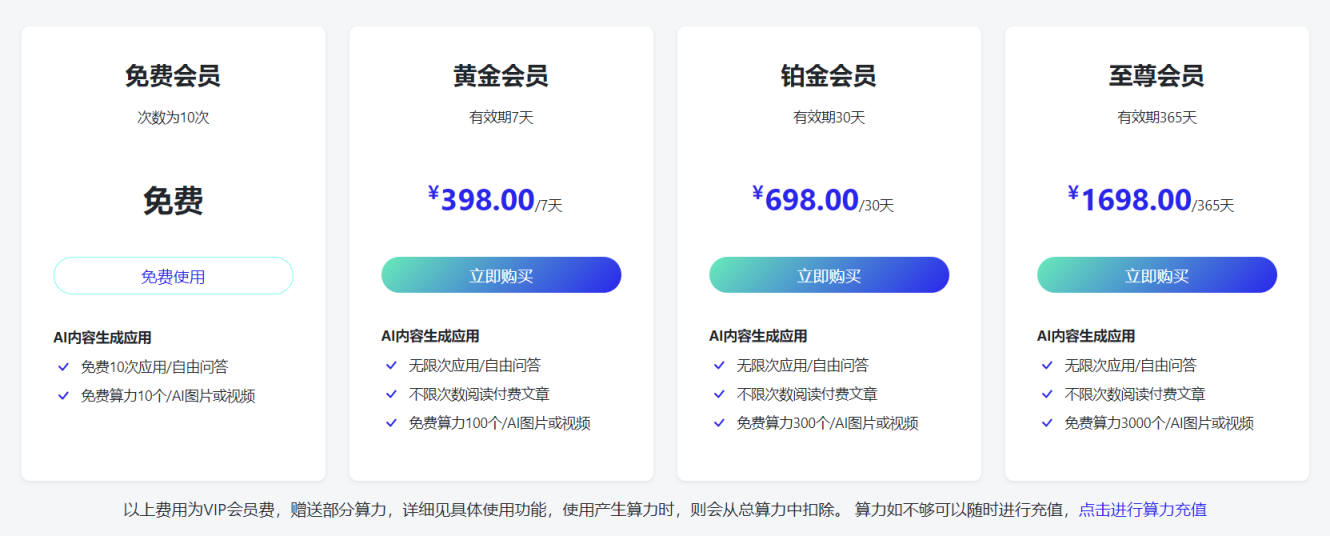 铂金会员:同样提供无限次AI内容生成应用/自由问答和不限次数阅读付费文章,额外包括100个免费算力用于AI图片或视频,价格为698元/30天。