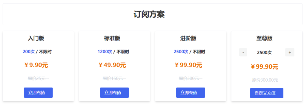 进阶版:提供2500次服务,不限时使用,价格为99.90元