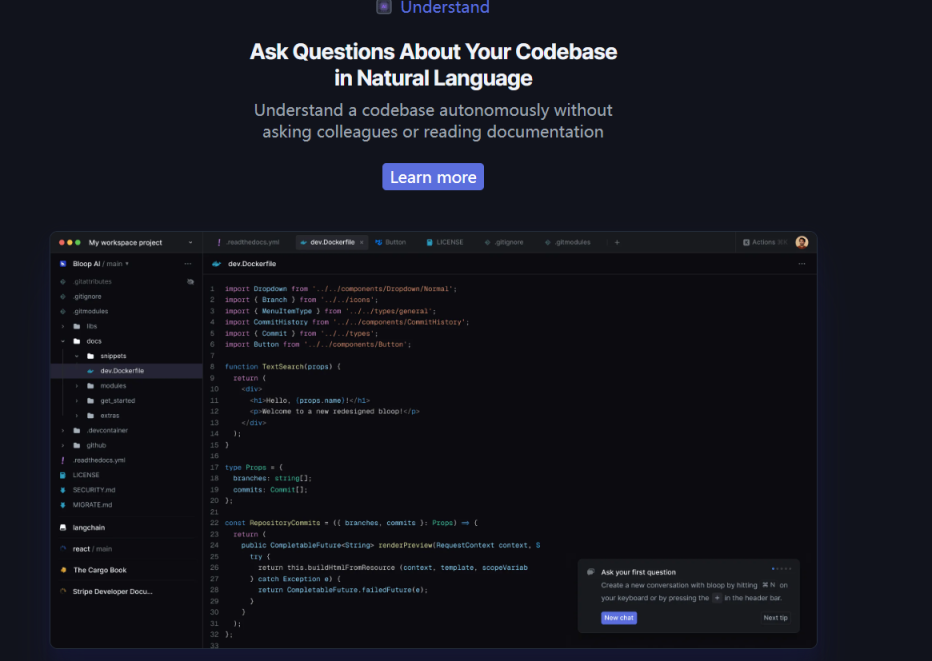 通俗的来说就是可以直接在本地,对你的代码项目提问,然后bloop直接回答你相关的问题。主要编程语言使用的是Rust和 TypeScript。