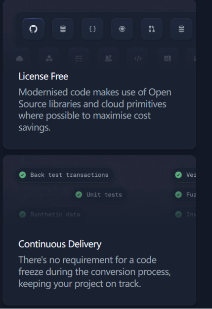 现代化的代码尽可能使用开源库和云原语,以最大限度地节约成本。在转换过程中不需要冻结代码,从而使项目保持正常。