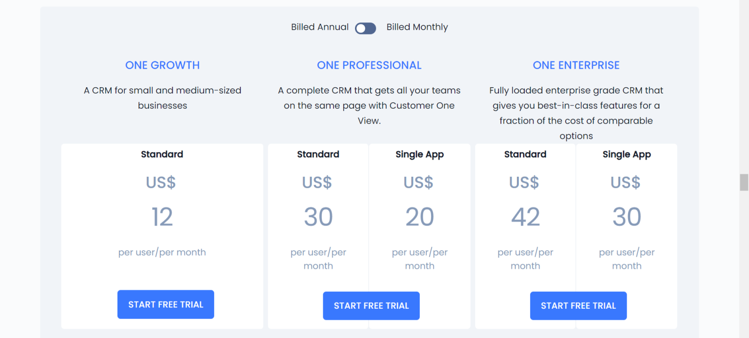 用户可以利用混合定价来降低成本,只需为大多数用户选择更低的单应用程序许可证,而不是支付标准许可证费用。用户可以根据实际使用情况付费,选择标准用户以获得对 Vtiger 中所有应用程序的全部业务功能的完全访问权限,或选择单应用程序用户,他们可以在五个应用程序中选择一个应用程序进行读写访问,并对其他四个应用程序中的模块进行只读访问,以获得全面的360度视图。标准用户的年度计费为每月42美元,而单应用程序用户的年度计费为每月20美元。