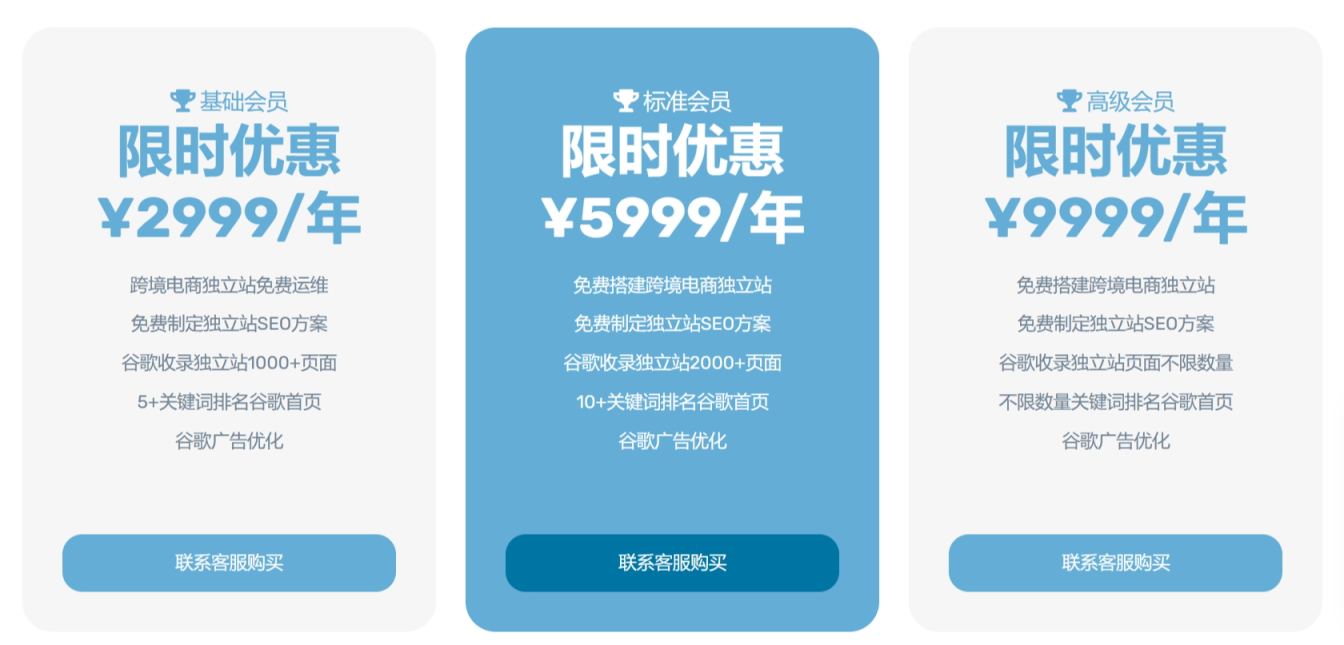 标准版:包含免费搭建跨境电商独立站、免费制定独立站SEO方案、谷歌收录独立站2000+页面、10+关键词排名谷歌首页、谷歌广告优化。