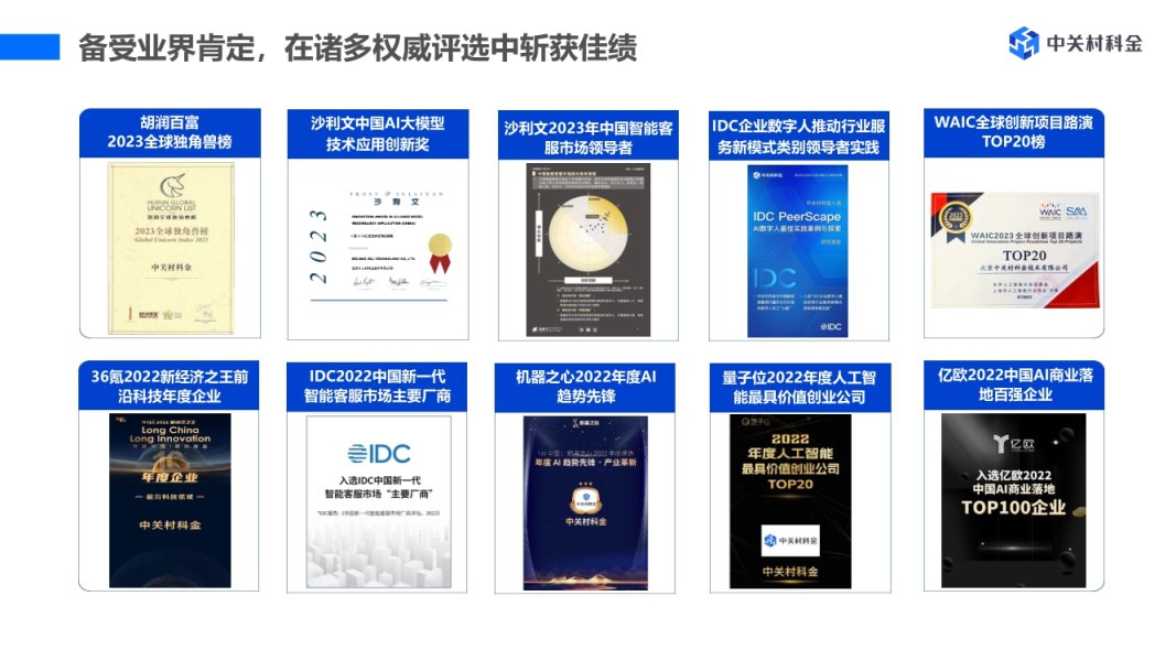 通过自主研发的领域大模型、大数据分析、多模态交互三大核心技术,中关村科金构建了一个坚实的技术底座—生成式得助对话引擎,并基于此打造数字化洞察与营销、数字化服务与运营、数“智”底座三大矩阵,全面升级云呼叫中心、智能客服、智能外呼、质检陪练、智能音视频等产品,实现高效率、低成本、规模化的AI创新应用。累计申请受理292项专利,获得298项软著及CMMI5国际认证。其中人脸识别、声纹识别等人工智能前沿技术领先行业,屡获国际大奖。
