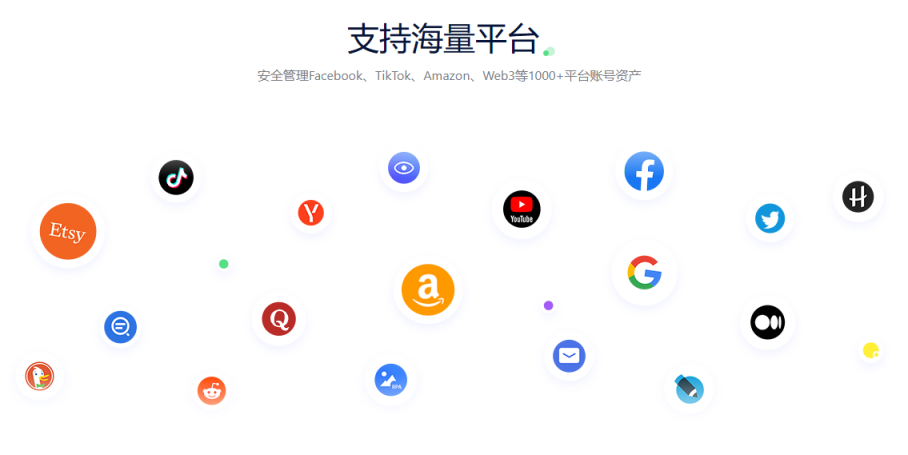 安全管理Facebook、TikTok、Amazon、Web3等1000+平台账号资产。
