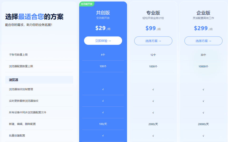ClonBrowser设置了多档定价,分为共创版、专业版、企业版。选择下方适合您的方案,灵活调整浏览器配置环境存储数量,高效分配与管理团队工作,自动化功能代替工作操作,以一当十。