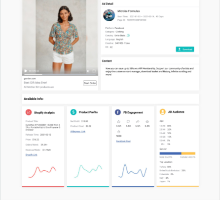 你可以查看产品的订单数量、竞争度、产品在哪些国家/地区表现好、查看商品定位的FB广告投放情报等。