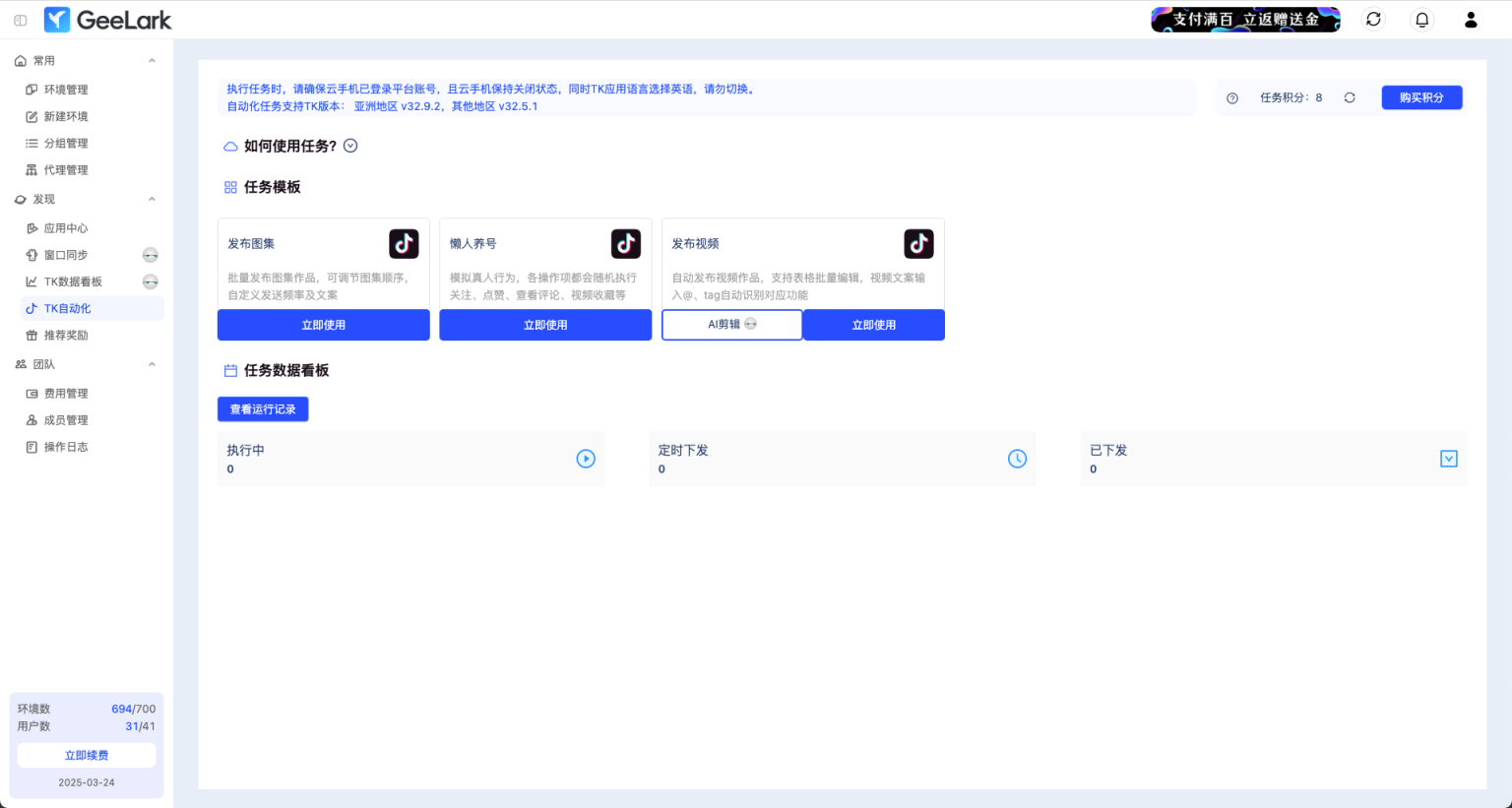 自动化任务执行:GeeLark内置了强大的自动化功能,包括自动发布视频、自动发布图集以及账号懒人养号等。这些功能可以大大减轻用户的手动操作负担,提高营销效率。用户只需设置好任务计划,GeeLark就能自动执行并发布内容,保持账号的活跃度和曝光率。