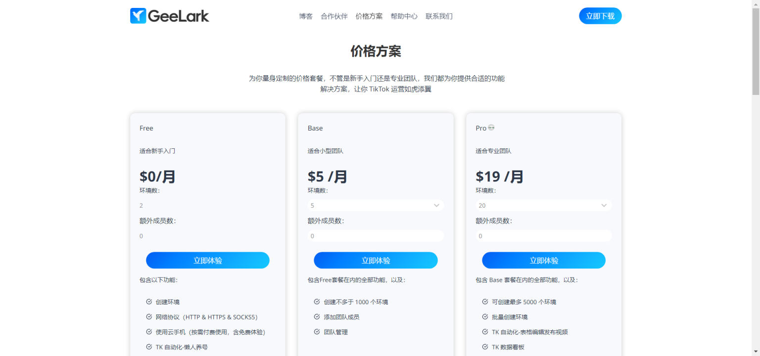 GeeLark针对不同的人群提供了不同的定价方案,包括适合新手入门的Free版,适合小型团队的Base版,适合专业团队的Pro版。