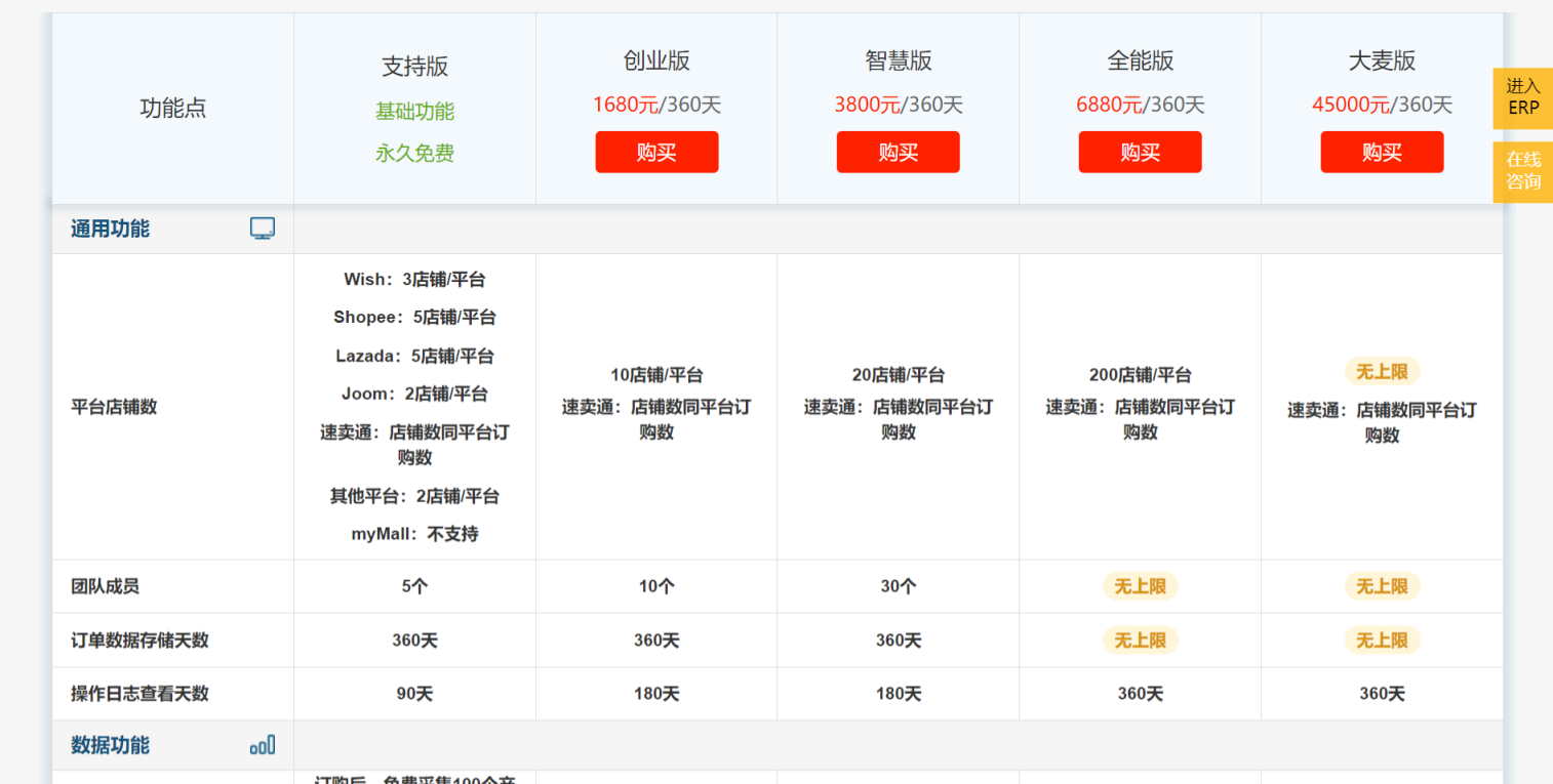 创业版:提供更多通用功能和数据功能,支持特定平台店铺数和团队成员数,适用于中小规模业务,有需求对特定平台数据分析和处理的用户。