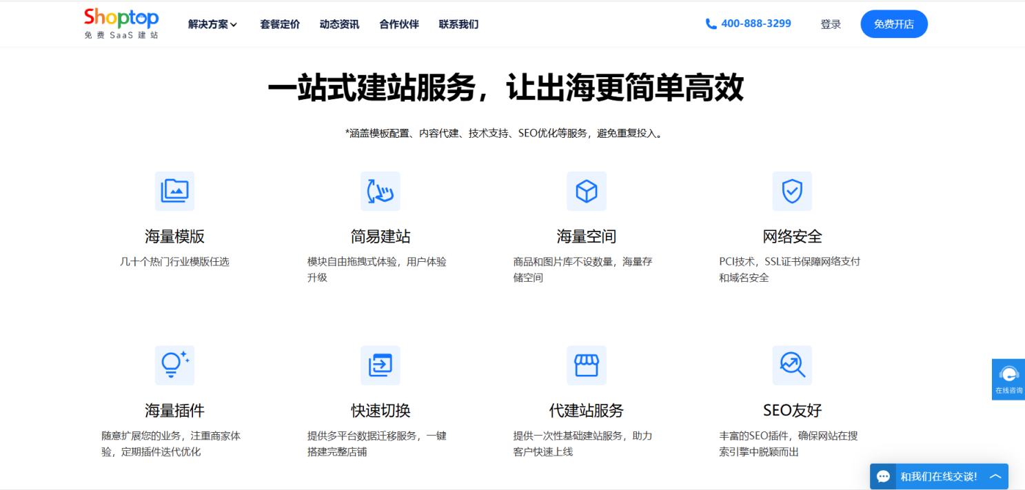 建站系统包含广告投放、私域营销、数据驱动、全链集成等丰富功能,覆盖网站搭建、品牌营销、运营指导到支付成单等独立站出海全流程。