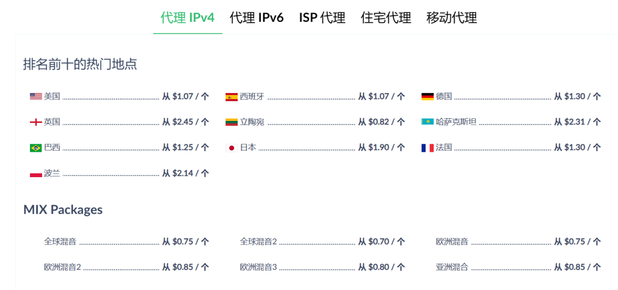 proxy-seller根据使用地区进行定价,分为代理IPv4、代理IPv6、ISP代理、住宅代理和移动代理。
