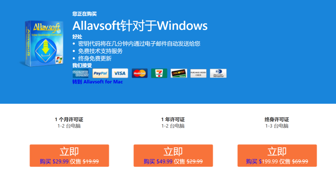 Allavsoft提供三种时限套餐供用户选择购买,分别为一个月,一年以及永久套餐,月付和年付都最多只支持两台电脑使用,永久套餐可支持三台,用户可以根据需求进行选择
