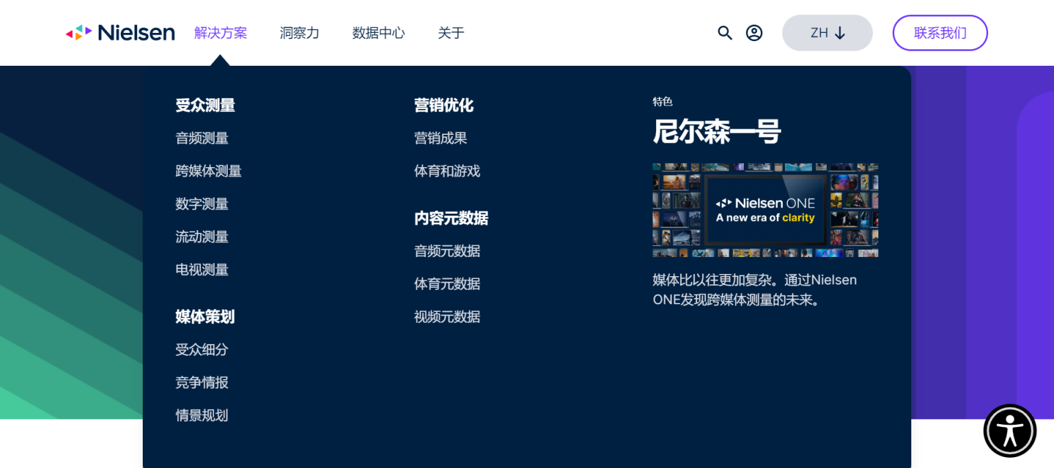 尼尔森(Nielsen)是全球领先的独立的受众测量与数据公司,塑造着媒体未来。他们专注于快速消费品、消费者行为和媒体领域的测量和数据分析。覆盖全球 100 多个国家,在 90% 以上的全球 GDP 和人口范围内提供服务。尼尔森以测量消费者的观看行为(节目和广告)和购买行为(类别、品牌、产品)为特色,为客户提供全球和本地层面的数据,展示消费者选择的交汇点。