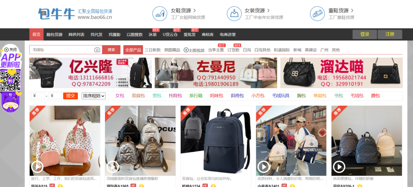 包牛牛是北京聚源百成网络科技有限公司旗下的专业箱包产地货源网站,平台所有产品信息(含图片及视频)来自于注册商户的上传和发布,版权归属于对应的注册用户。 依托于河北白沟以及广州狮岭产地优势为广大网销卖家提供一站式的箱包类商家信息、货源信息等。各类箱包款式实时更新, 每天上新数百款箱包让你随时掌握行业动态,卖家通过一键发布应用即可将厂家的商品发布到淘宝、天猫、阿里、速卖通、拼多多、虾皮、抖音小店、快手、微店、蘑菇街和微信等第三方电商平台, 摒弃了传统的上门选款、加好友进空间等极为费时耗力的人力模式,为广大卖家朋友探索出了:商家—平台—卖家的形式,使用户实现了“足不出户便知市场最新动态”,让你身处任何地方都能坐享产地的优势货源。