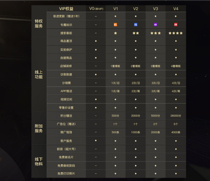 17网提供了会员服务,VIP档口会员分为V1、V2、V3、V4四个VIP等级,不同等级尊享不同的VIP增值服务,级别越高,享受到的权益越多、越高级。